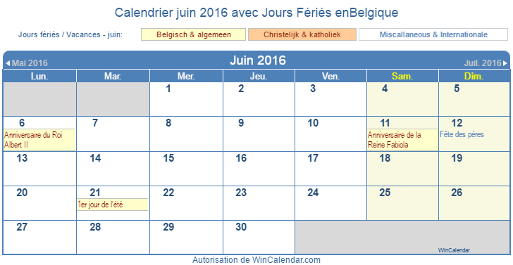 juin 2016 Calendrier à imprimer- Belgique