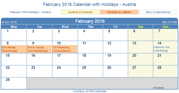 Printable February 2016 Calendar with Holidays -Austria