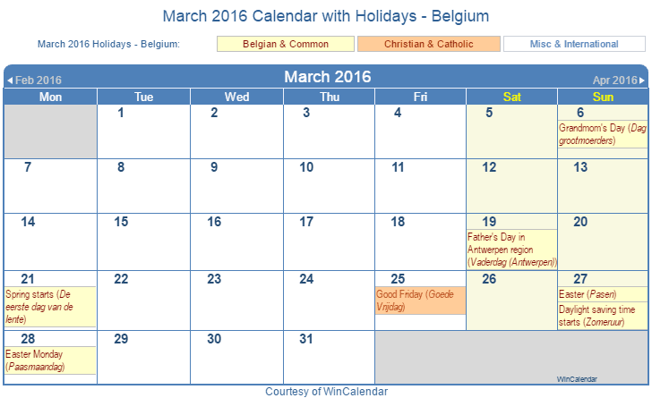Printable March 2016 Calendar with Holidays -Belgium
