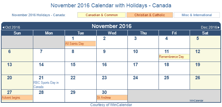 Printable November 2016 Calendar with Holidays -Canada