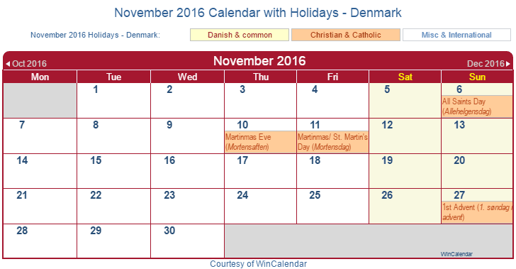 Printable November 2016 Calendar with Holidays -Denmark