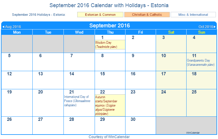 Printable September 2016 Calendar with Holidays -Estonia