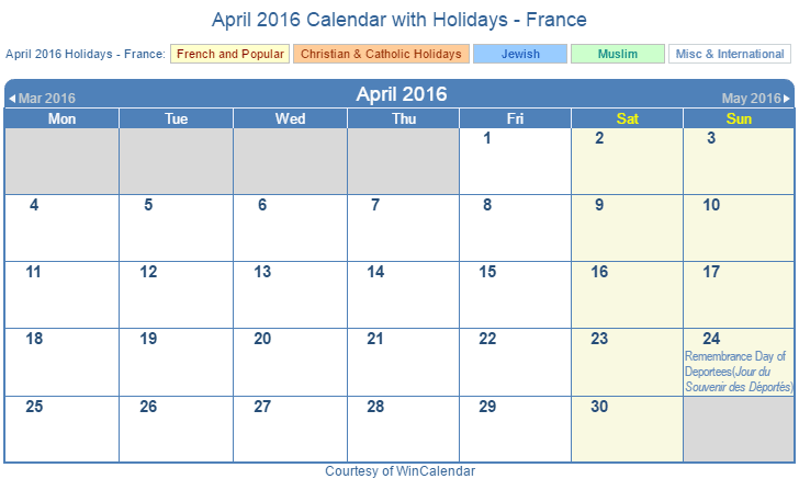 Printable April 2016 Calendar with Holidays -France