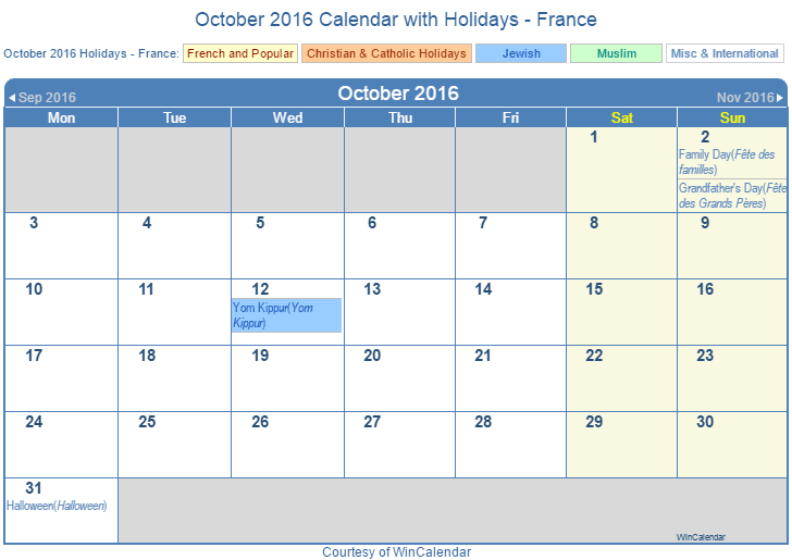 Printable October 2016 Calendar with Holidays -France