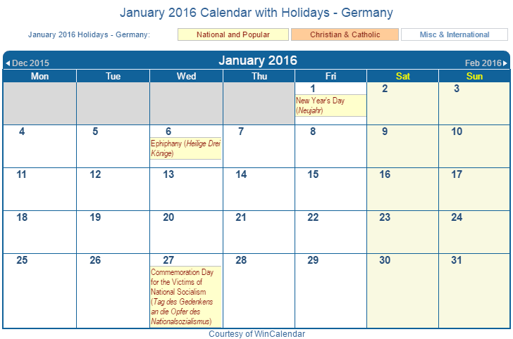 Printable January 2016 Calendar with Holidays -Germany
