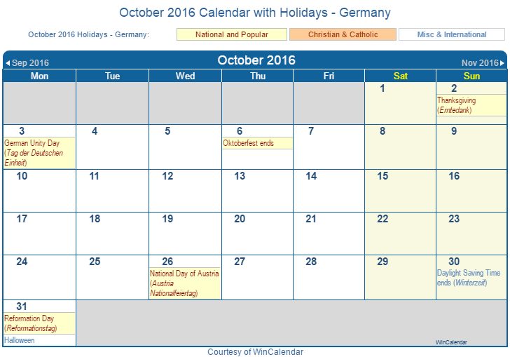 Printable October 2016 Calendar with Holidays -Germany