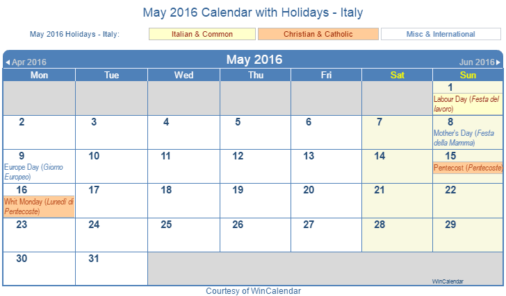 Printable May 2016 Calendar with Holidays -Italy
