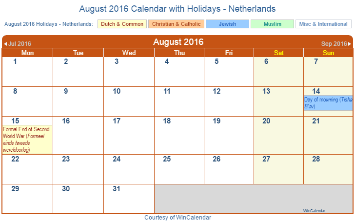Printable August 2016 Calendar with Holidays -Netherlands
