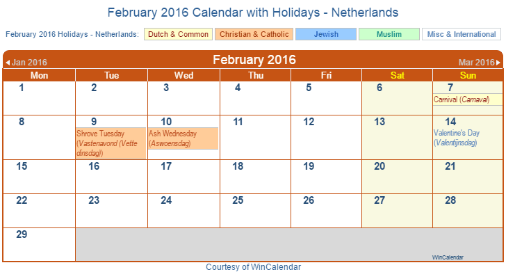 Printable February 2016 Calendar with Holidays -Netherlands