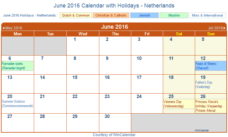 Printable June 2016 Calendar with Holidays -Netherlands