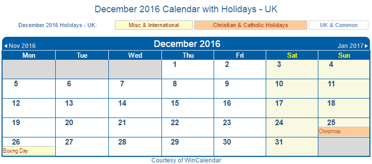 Printable December 2016 Calendar with Holidays -UK