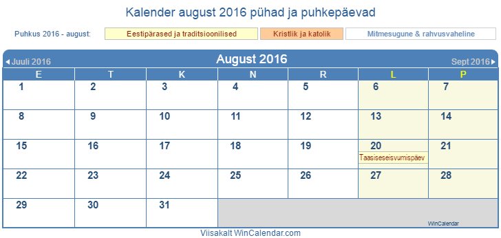 august 2016 Kalender printida - Eesti