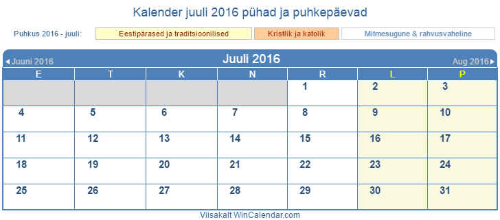 juuli 2016 Kalender printida - Eesti