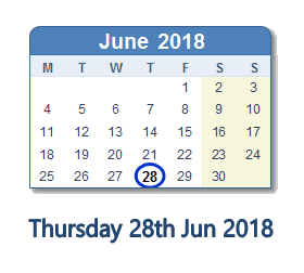 28 June 2018 calendar