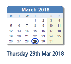 March 29, 2018 calendar