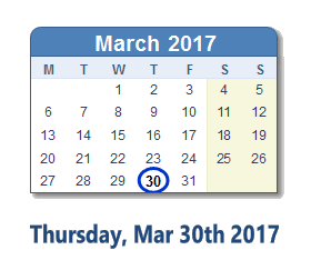 March 30, 2017 calendar