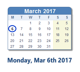 March 6, 2017 calendar