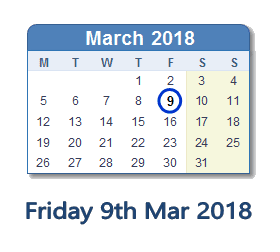 March 9, 2018 calendar
