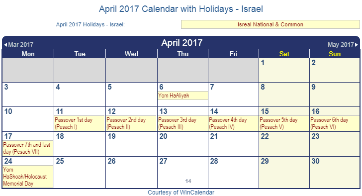 Printable April 2017 Calendar with Holidays -Israel