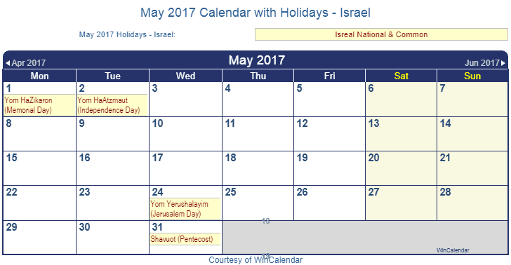 Printable May 2017 Calendar with Holidays -Israel