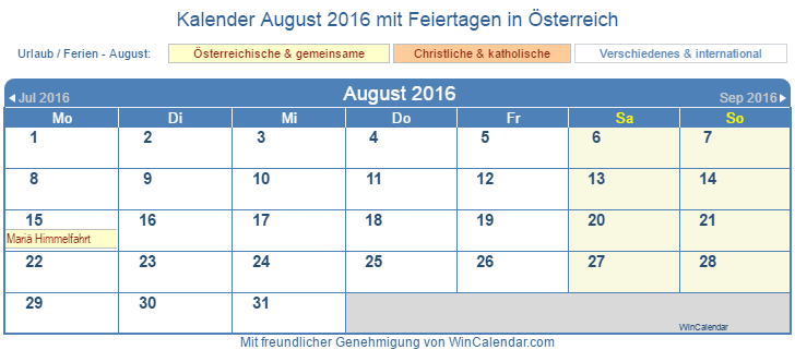 Kalender August 2016 mit Feiertagen zu drucken - ÖSTERREICH