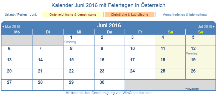Kalender Juni 2016 mit Feiertagen zu drucken - ÖSTERREICH
