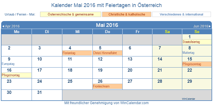 Kalender Mai 2016 mit Feiertagen zu drucken - ÖSTERREICH