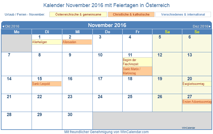 Kalender November 2016 mit Feiertagen zu drucken - ÖSTERREICH