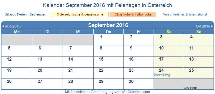 Kalender September 2016 mit Feiertagen zu drucken - ÖSTERREICH