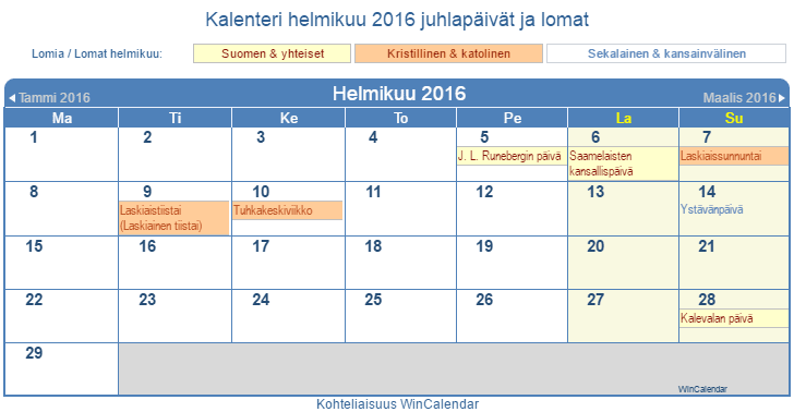 Kalenteri helmikuu 2016 julkisissa juhlapäivinä -Suomi