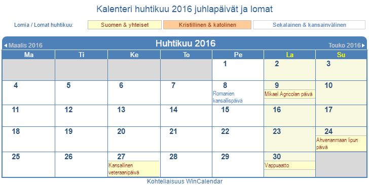 Kalenteri huhtikuu 2016 julkisissa juhlapäivinä -Suomi