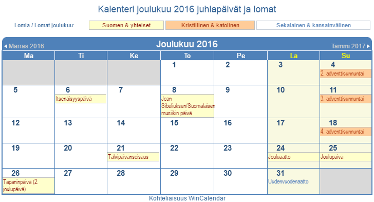 Kalenteri joulukuu 2016 julkisissa juhlapäivinä -Suomi