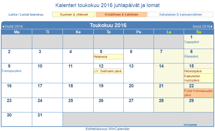 Kalenteri toukokuu 2016 julkisissa juhlapäivinä -Suomi