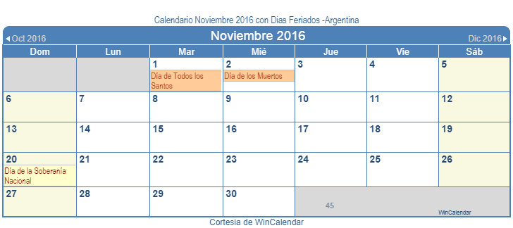 Calendario Noviembre 2016 para imprimir - con dias festivos y feriado Argentina