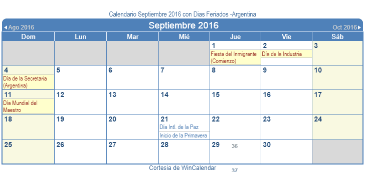 Calendario Septiembre 2016 para imprimir - con dias festivos y feriado Argentina