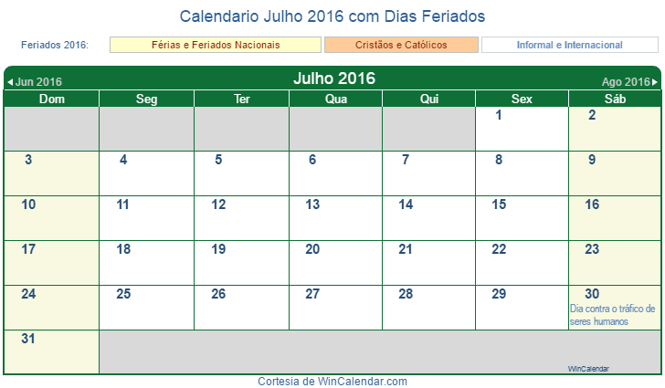Calendário Julho 2016 com feriados para imprimir - Brasil