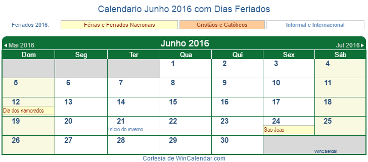 Calendário Junho 2016 com feriados para imprimir - Brasil
