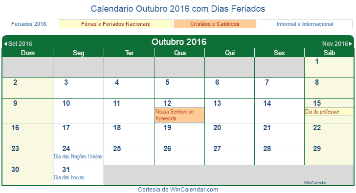 Calendário Outubro 2016 com feriados para imprimir - Brasil