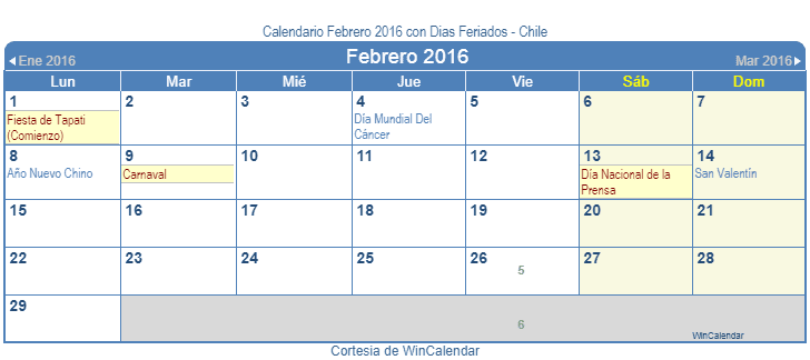 Calendario Febrero 2016 para imprimir - con dias festivos y feriado Chile