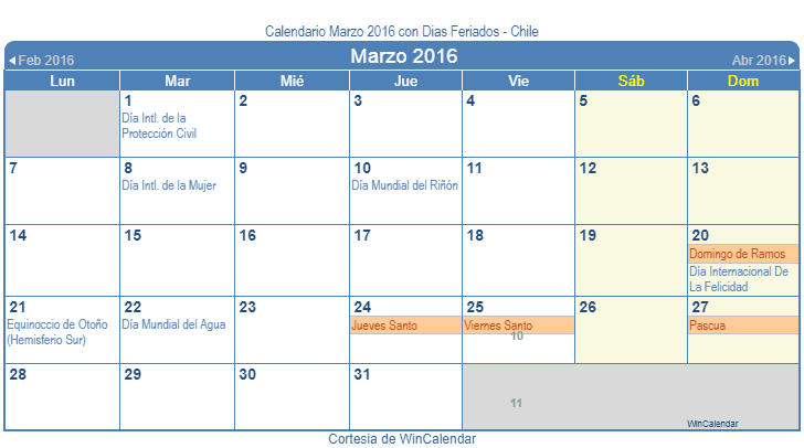 Calendario Marzo 2016 para imprimir - con dias festivos y feriado Chile
