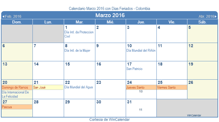 Calendario Marzo 2016 para imprimir - con dias festivos y feriado Colombia