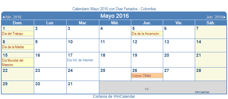 Calendario Mayo 2016 para imprimir - con dias festivos y feriado Colombia