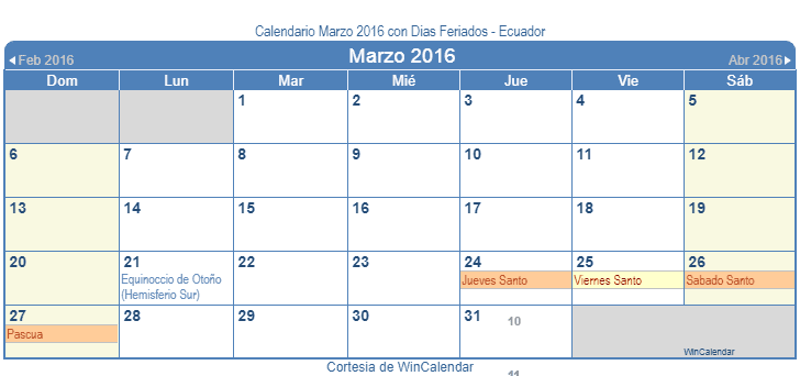Calendario Marzo 2016 para imprimir - con dias festivos y feriado Ecuador