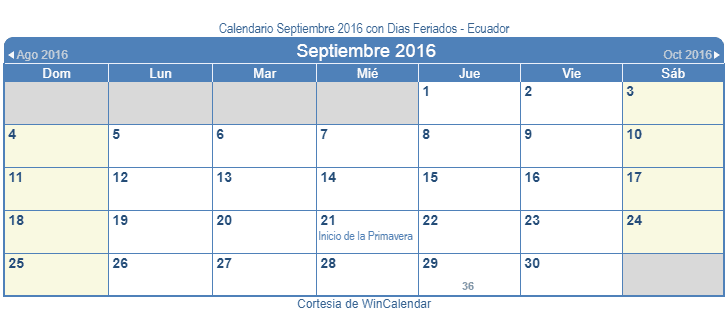 Calendario Septiembre 2016 para imprimir - con dias festivos y feriado Ecuador