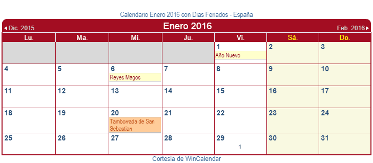 Calendario Enero 2016 para imprimir - con dias festivos y feriado España