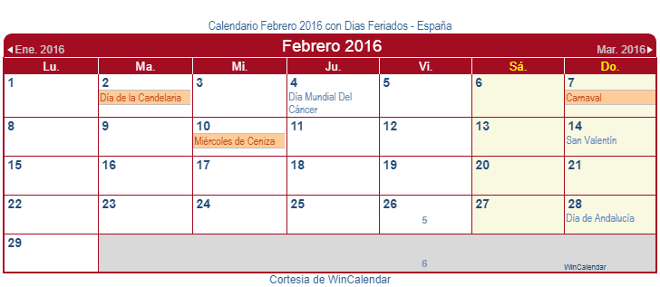 Calendario Febrero 2016 para imprimir - con dias festivos y feriado España