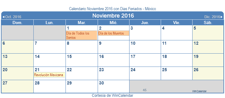 Calendario Noviembre 2016 para imprimir - con dias festivos y feriado México