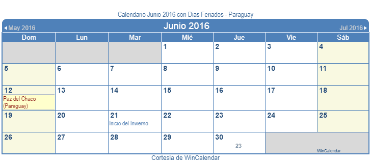 Calendario Junio 2016 para imprimir - con dias festivos y feriado Paraguay