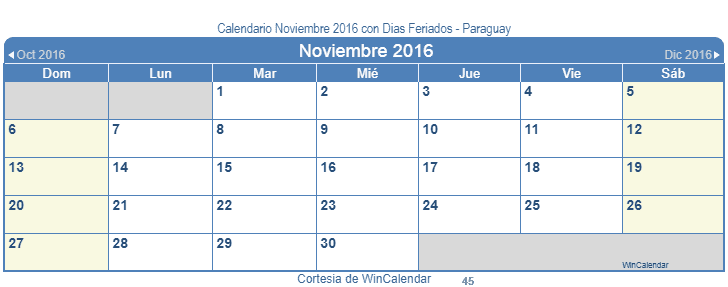 Calendario Noviembre 2016 para imprimir - con dias festivos y feriado Paraguay