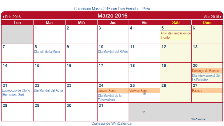 Calendario Marzo 2016 para imprimir - con dias festivos y feriado Perú